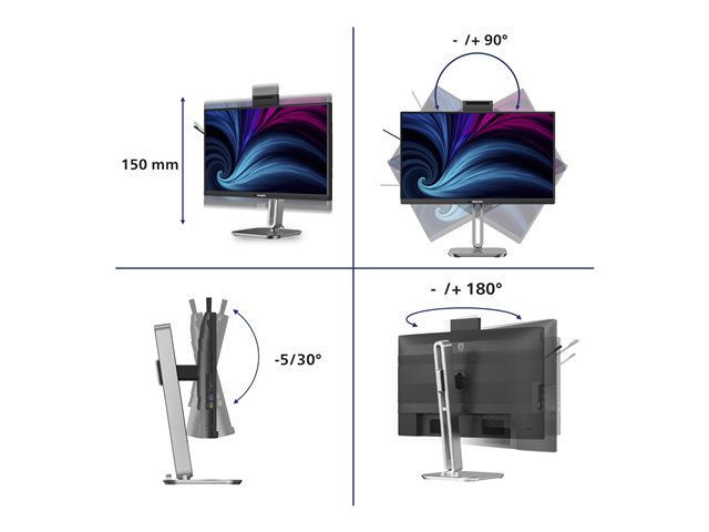 DisplaylägesjusteringarHöjd, pivot (rotation), vridbar bas, lutning