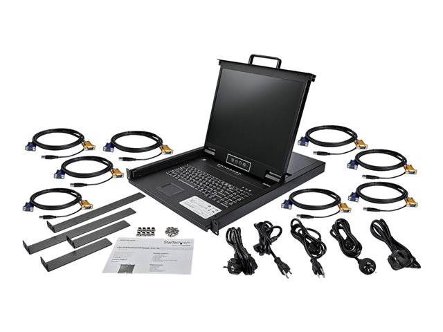 StarTech.com 8-ports rackmonterad KVM-konsol med 1,8 m kablar - Integrerad KVM-switch med 19-tums LCD-skärm - 1U LCD KVM-låda - OSD KVM - Hållbar 50 000 MTBF - USB + VGA-support - KVM-konsol med omkopplare för tangentbord/video/mus - 8 portar - PS/2, USB - USA - engelska (QWERTY) - 19" - kan monteras i rack - 1280 x 1024 - 250 cd/m² - 1000:1 - VGA - svart - 1U