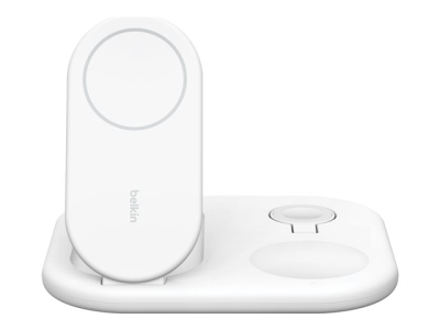 Belkin BoostCharge 3-in-1 - Trådlöst laddställ - magnetisk, hopfällbar, med Qi2 + växelströmsadapter - 15 Watt - Fast Charge - vit