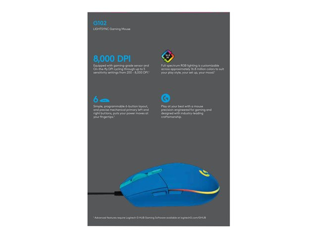 Make the most of your game time with the G102 gaming mouse featuring LIGHTSYNC technology, a gaming-grade sensor and a classic six-button design. Light up your game and your desk.