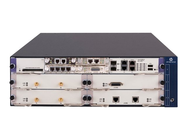 HP MSR50 Series routers are a component of the HP FlexBranch solution, which is part of the HP FlexNetwork architecture. These routers are designed for large branch offices, regional offices, and enterprise deployments that require high-performance converged routing, switching, wireless, security, voice, and virtualized applications. The MSR50 Series has a rich set of modular WAN, LAN, and voice interface connectivity options, as well as embedded hardware-based encryption and voice processing. With optional Open Architecture Platform (OAP) modules, it can deliver VMware vSphere, an industry-leading virtualization platform that integrates third-party applications with the router.