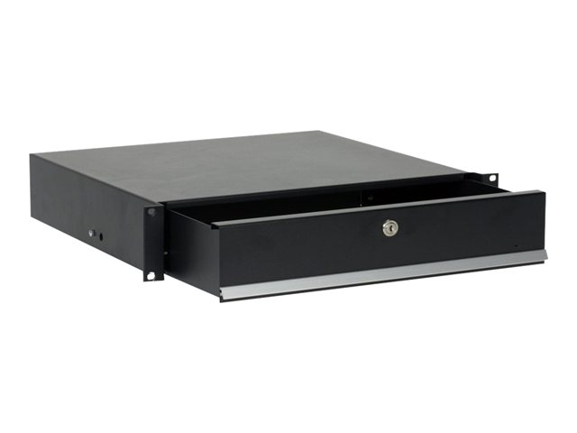 This product mounts on HPE 10000 Series racks with sliding rails and is used to store CDs, instruction manuals, tools, and any other item that is frequently used at the rack. Drawer includes lock.